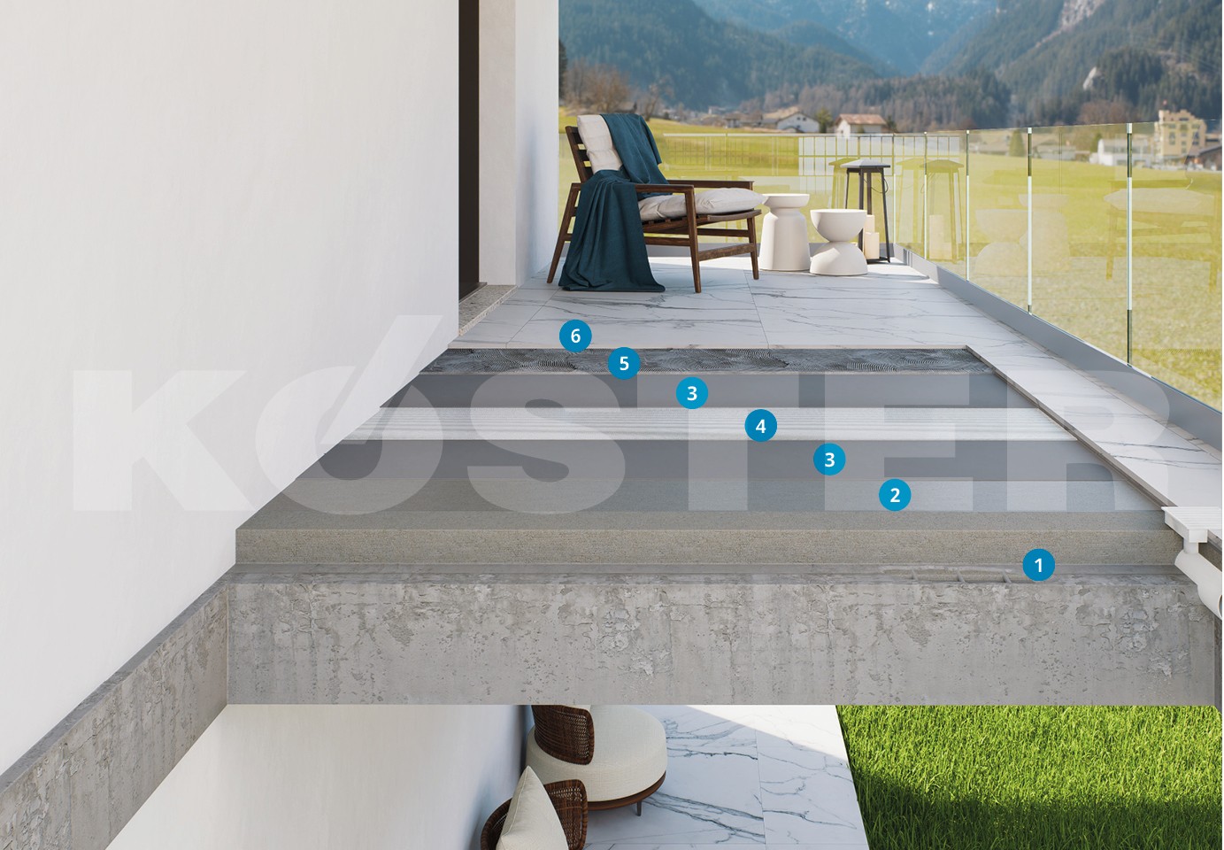 The mineral waterproofing of balconies and terraces is carried out with crack bridging KÖSTER NB Elastic (white or grey). This waterproofing is resistant to foot traffic and can be covered with tiles. It also bonds to damp substrates.