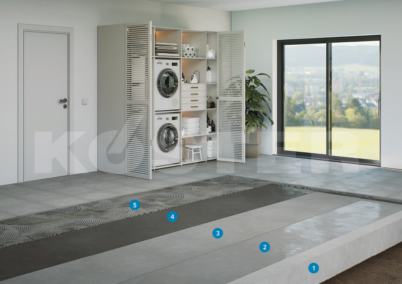 The self-leveling floor system begins with the preparation of the concrete substrate, ensuring a smooth and clean surface. The substrate is then primed with KÖSTER Polysil TG 500, which hardens the substrate and reduces the mobility of salts. Following the priming process, KÖSTER NB 1 Grey slurry is applied in two layers crosswise for an optimal waterproofing. This cementitious waterproofing solution, fortified with crystallizing agents, offers exceptional resistance to pressure, abrasion, and chemical elements, making it suitable for both positive and negative side waterproofing applications. Once the waterproofing layer is completed, KÖSTER SL Premium self-leveling underlayment is poured, creating a flawlessly smooth and level surface that’s ready to receive various flooring systems. This high-quality, fast-setting compound creates a smooth, tension free, level surface within hours. It accommodates thicknesses ranging from 5 to 15 mm and can be feathered out to 2 mm with suitable tools, making it ideal for uneven concrete, providing a durable foundation for subsequent flooring systems such as tile.