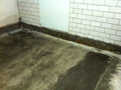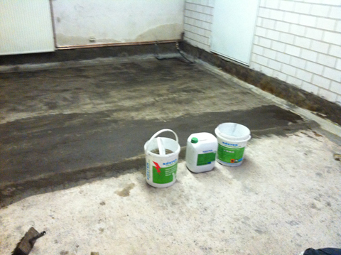 Ausgangsproblem: Ständige Feuchtigkeit im Wand-Sohlenbereich (zwischen Bodenplatte und aufgehender Wand). Abdichtungslösung: Injektion des Fugenbereiches und anschließende mineralische Innenabdichtung der Bodenplatte.
