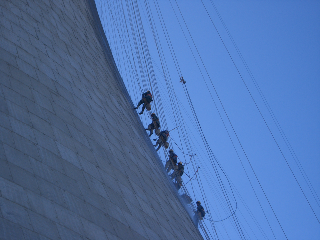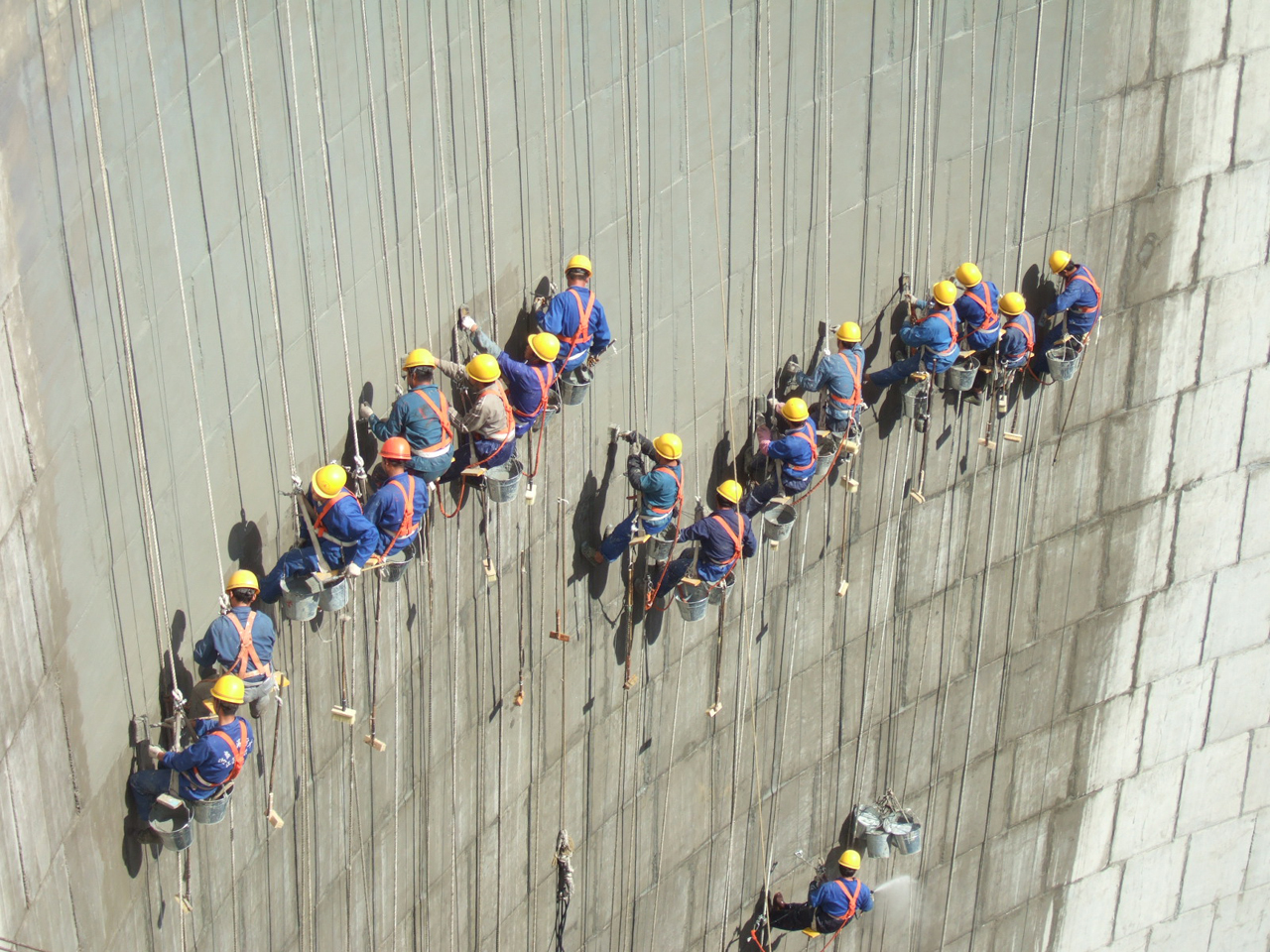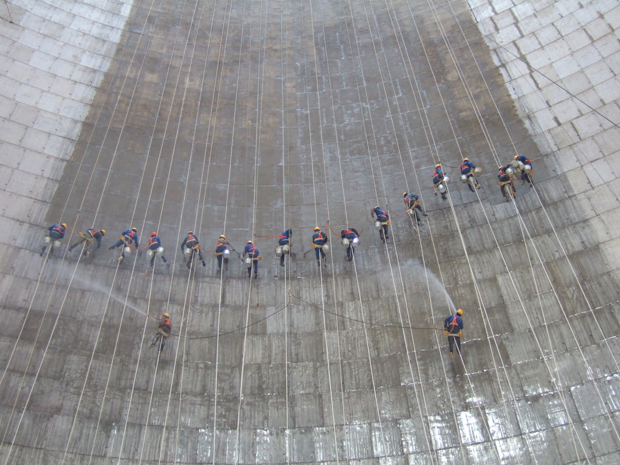 Protective coating of cooling towers. The total surface area of the two cooling towers to be protected was 110,000 m2. KÖSTER NB 1 Grey and KÖSTER Polysil® TG 500 were selected to coat and protect the cooling towers internal side and KÖSTER NB 1 Grey was selected for the external side. A team of highly skilled and experienced specialists in abseiling – all with statutory licences – was hired to brush apply KÖSTER NB 1 Grey and to spray apply KÖSTER Polysil® TG 500 using ordinary hand carried liquid sprayers.