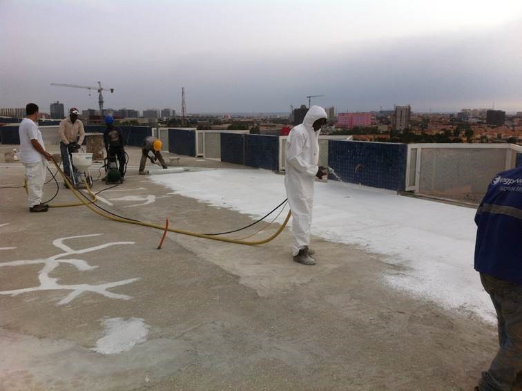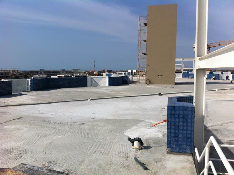 Waterproofing of flat roof with an area of 4500 m2 and terraces with a an area of 1800 m2 for a total area of 6300 m2.