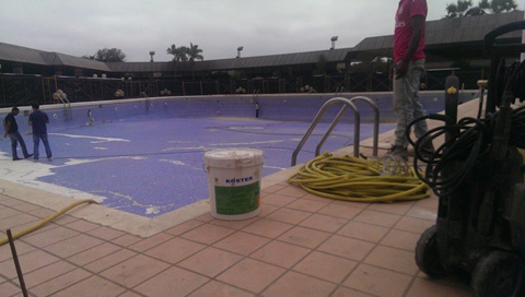 Reabilitação de piscina com 1500 m² através da decapagem do revestimento existente e aplicação de elástico bi-componente armado KÖSTER 21 em 2,5 kg/m² para posterior aplicação de massa de colagem de pastilha de piscinas.