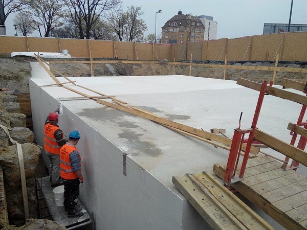 Uszczelnienie dna i ścian zbiornika wody deszczowej od wewnątrz i na zewnątrz za pomocą KÖSTER 21 z wtopieniem w narożach siatki Flexgewebe. Fasety wykonane materiałem KÖSTER Sperrmortel.