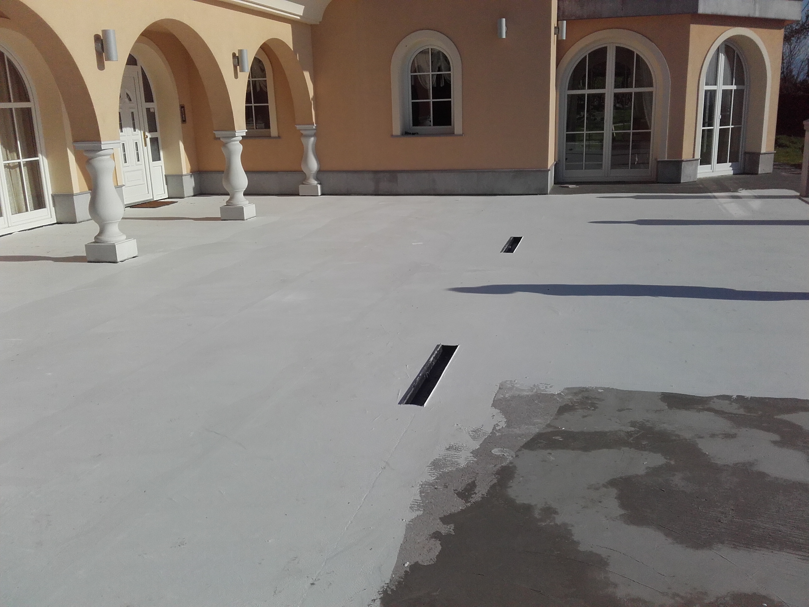 Odstranitev starih oblog in čiščenje podlage. Priprava in čiščenje celotne površine in na posameznih delih popravila in izravnava betonske plošče s Köster Reparaturno malto NC. Izdelava naklonov terase s Köster C-Coat. Tesnjenje stikov - med okrasnim robom in teraso, s Köster KBE Tekočo folijo. Izdelava tesnilnega sistema s Köster 21. Pred nanosom Köster 21 se je celotna površina prešpricala s Polysilom TG 500, kateri je dodatno utrdil podlago ter preprečil nastajanje in izločanje solitra. V prvi nanos Köster 21 je bila vgrajena Köster Armirna mrežica.