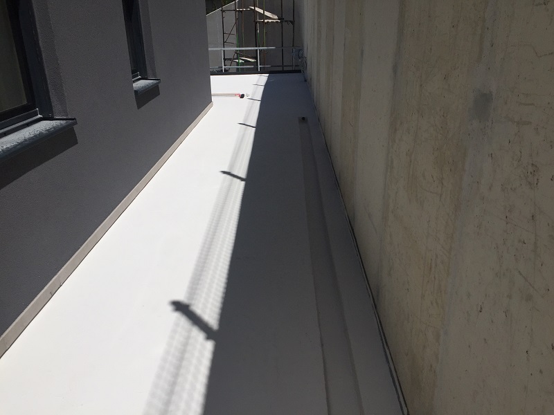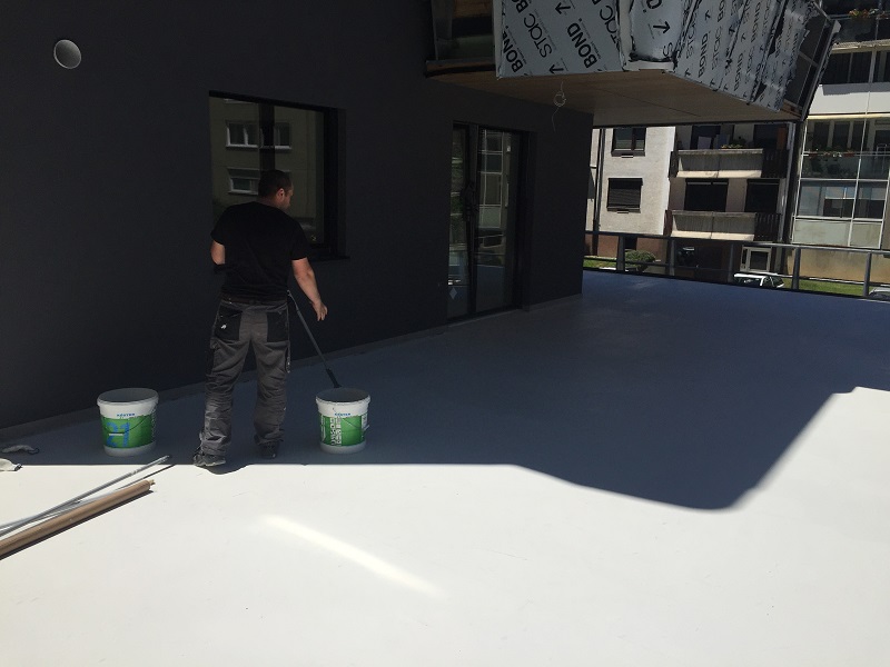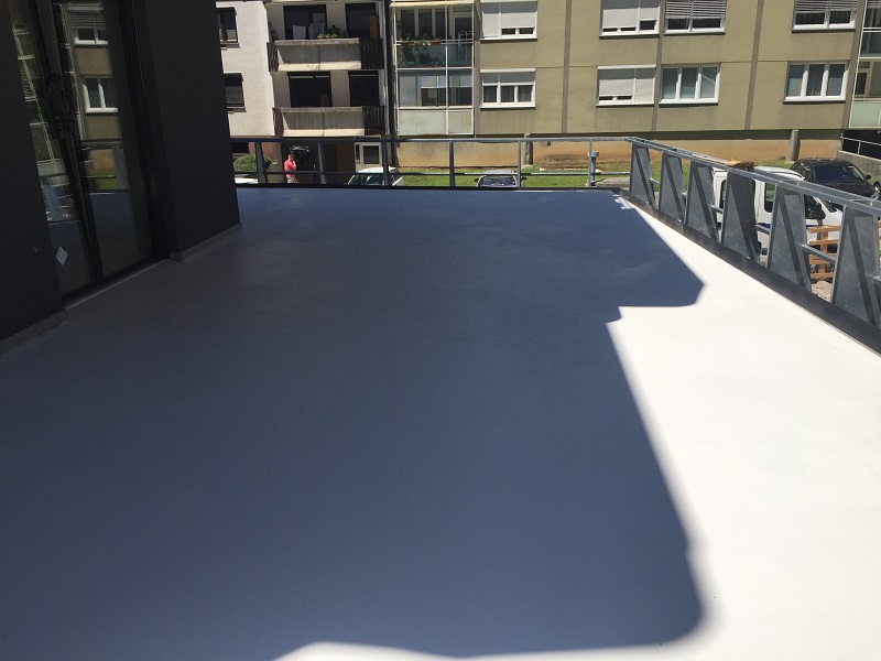 Izdelava tesnilnega sistema pod keramiko na terasah novega sodobnega štirinadstropnega stanovanjskega bloka ob Poti k Ribniku v Rakovniku.