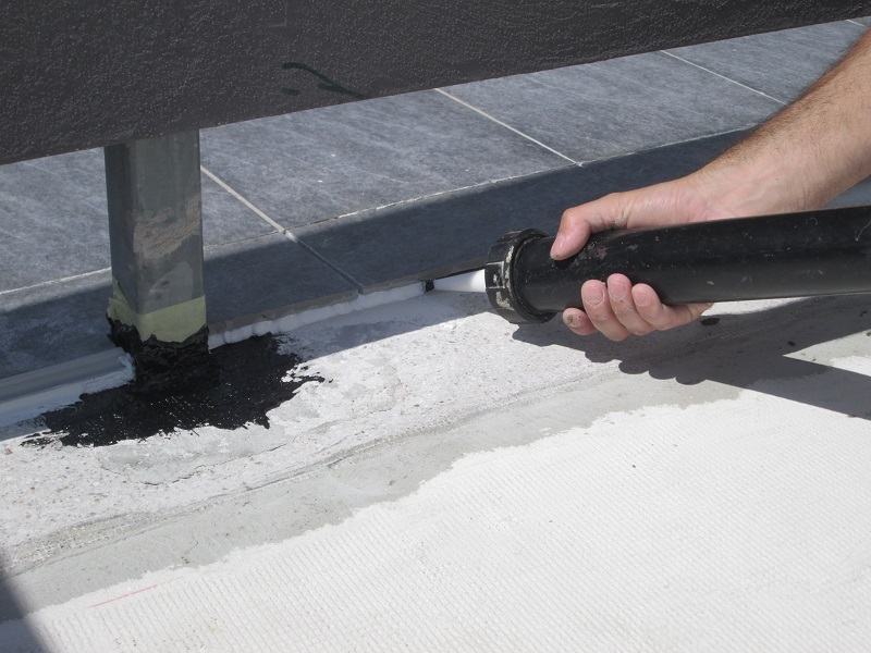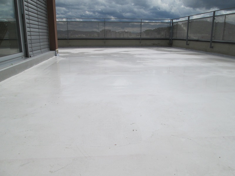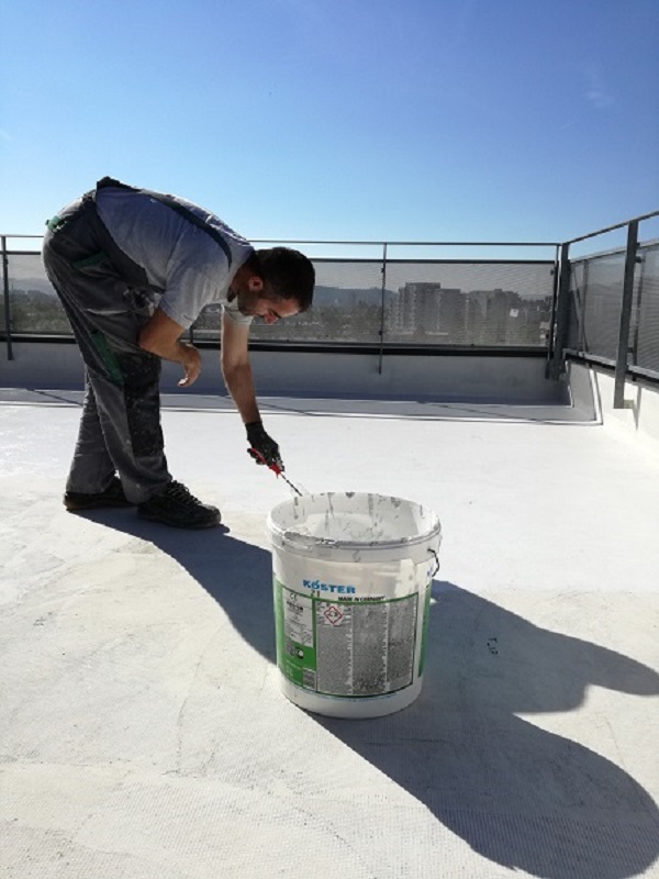 Sledila je vgradnja hidroizolacije. Na celotni površini se je naredil premaz s KÖSTER 21 v kombinaciji s KÖSTER armirno mrežico. Za tesnitev detajlov in stavbnega pohištva (npr. del, kjer je ograja pritrjena na površino, balkonska vrata) so uporabili KÖSTER KBE-tekočo folijo in KÖSTER Super flis.