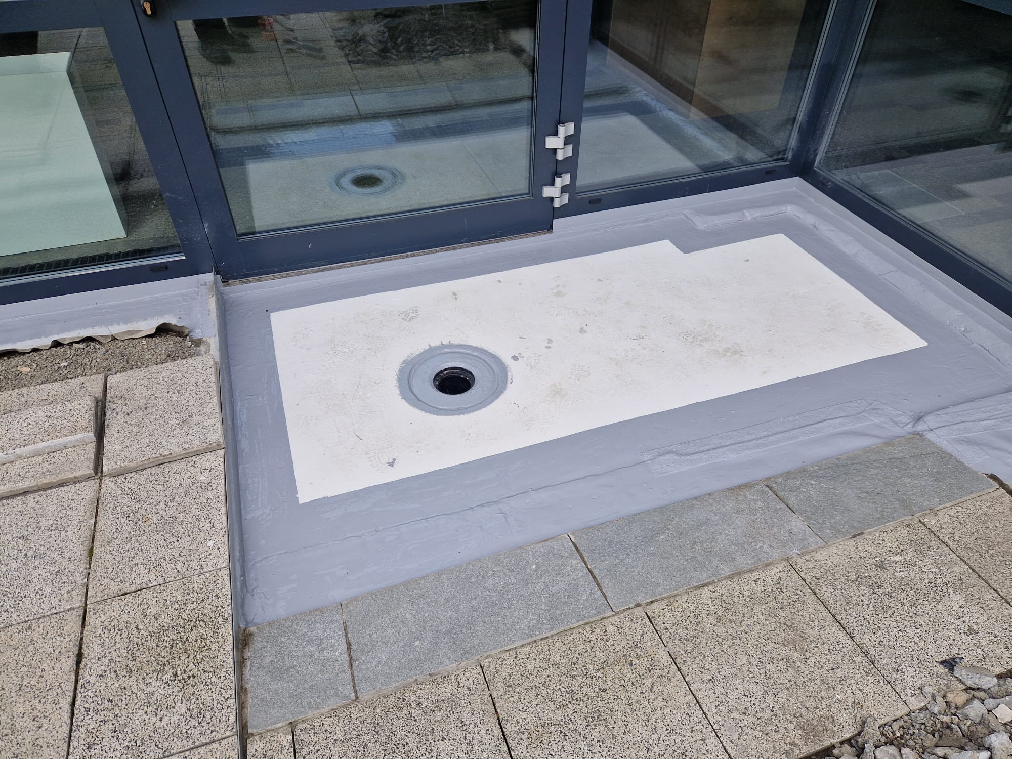 Doszczelnienie styku stolarki i odpływu wycieraczki na stadionie Akademii Wychowania Fizycznego w Krakowie. Zastosowane materiały: KOSTER 21, POLYSIL TG 500, MS Flexfolie, PU Primer 120, CT 121, Superleece