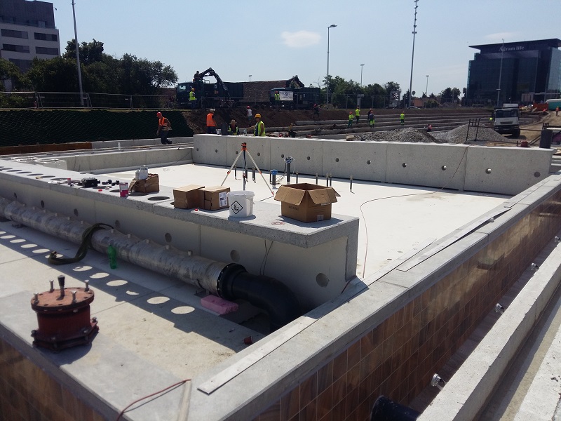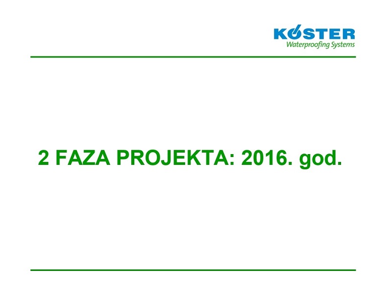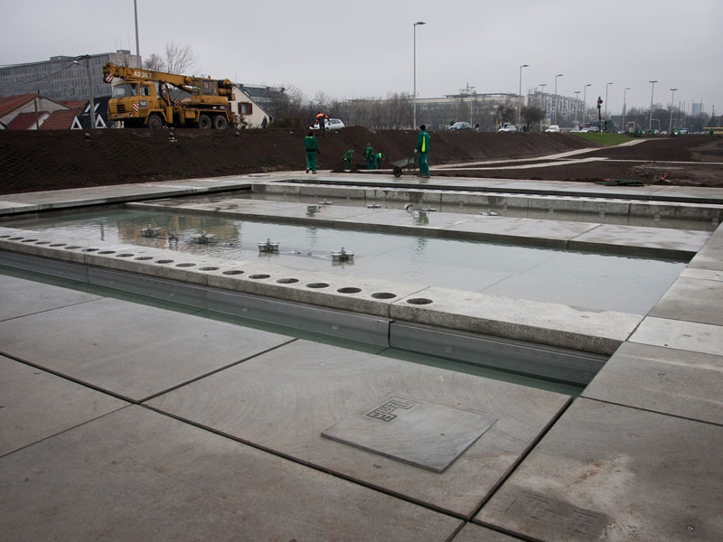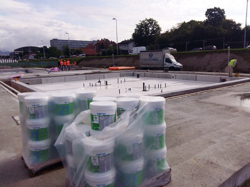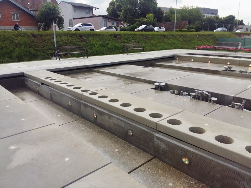 Hidroizolacija AB konstrukcije fontana izvedena s 2K polimercementom bijele boje - KÖSTER 21. Hidroizolacija izvedena u 2 sloja. Između slojeva premaza ugrađena je staklena, alkalno-otporna mrežica KÖSTER Armaturna Mrežica. 1. faza projekta - jesen 2012. god, 2 faza projekta - proljeće 2016. god.