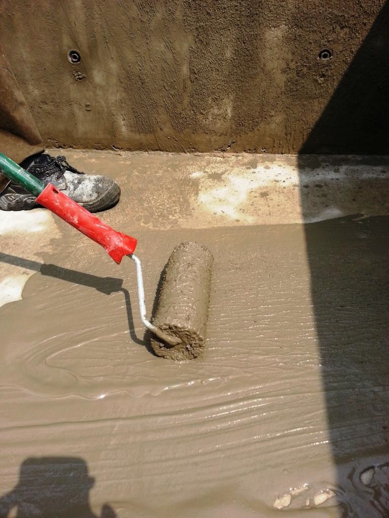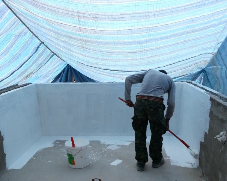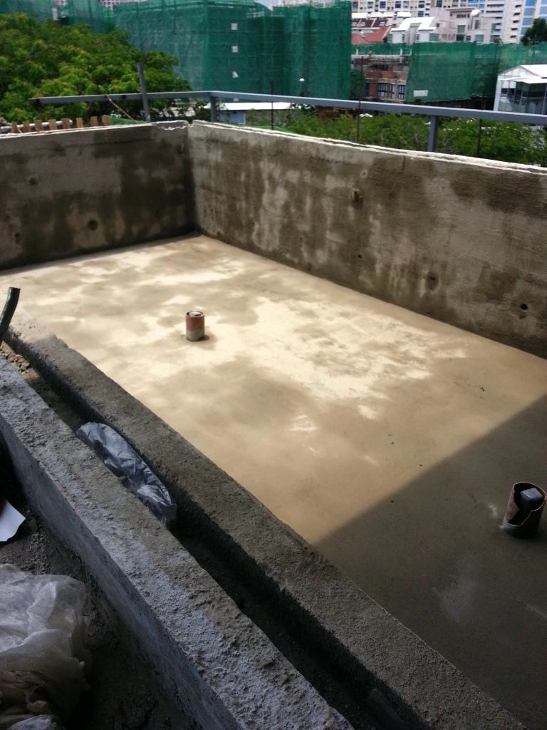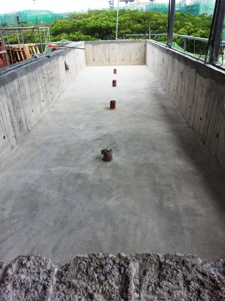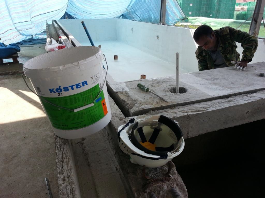 Double waterproofing application to a suspended swimming pool of a terrace unit to ensure proper water tightness. KÖSTER NB1 Grey applied first to act as 'secondary protection'. Afterwards KÖSTER 21 applied as crack bridging waterproofing material for 'primary protection'.