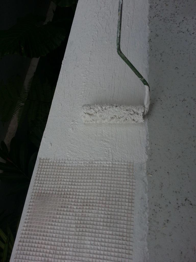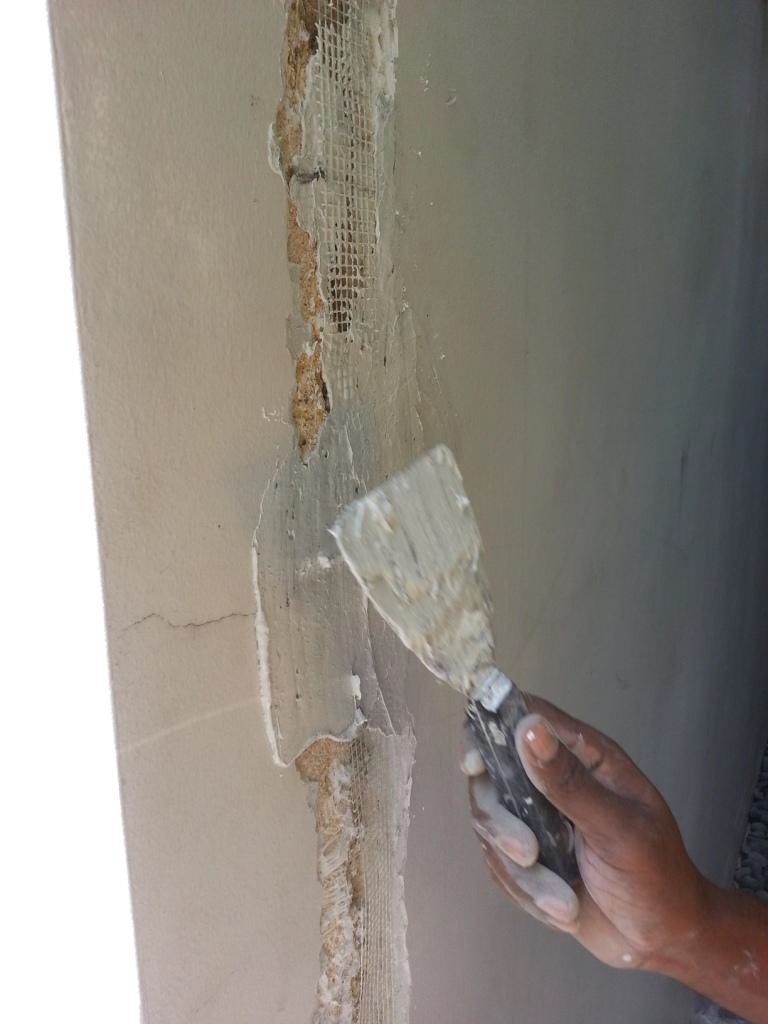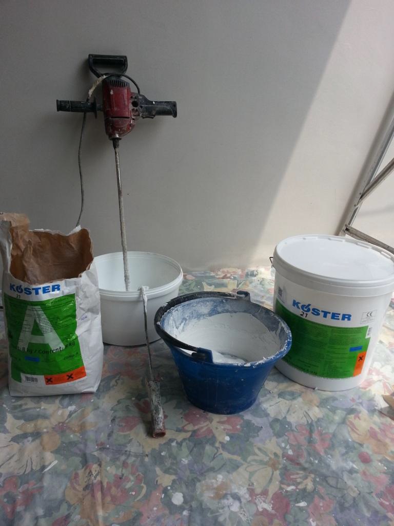 Fiber glass net embedded, new plastering applied followed lastly by KÖSTER 21 'crack bridging' coating