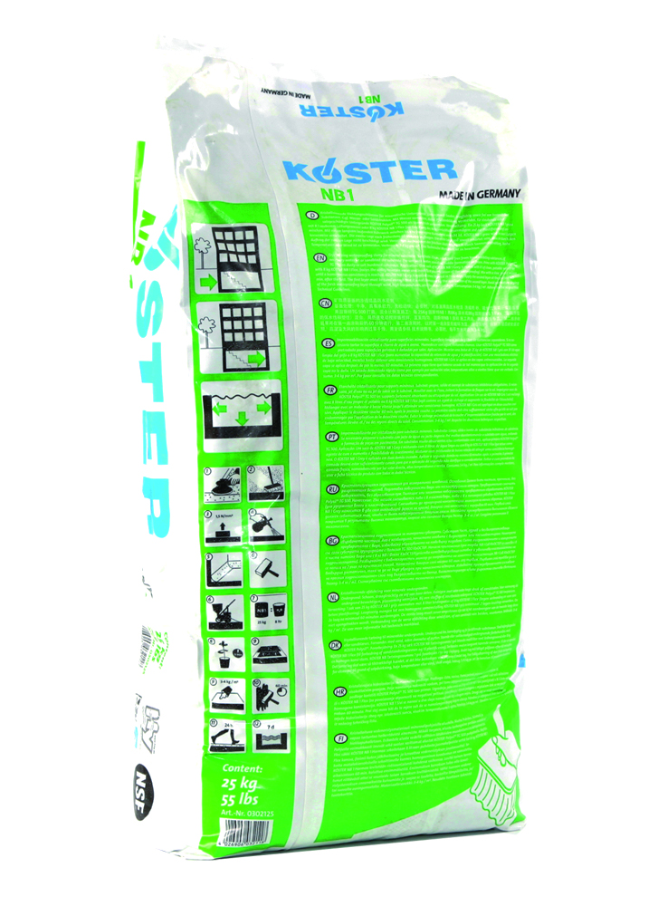 KÖSTER NB 1 Gris es una capa mineral que contiene sustancias cristalizantes y sustancias que cierran la capilaridad. Se usa para la impermeabilización contra agua de suelo y para agua penetrativa y no penetrativa. Aquellas impermeabilizaciones hechas con KÖSTER NB 1 Gris se caracterizan por su excelente resistencia a compresión y a abrasión igual que una excelente resistencia química, Si se aplica KÖSTER NB 1 Gris como capa cerrada, se obtiene una impermeabilización contra agua penetrativa hasta 13 bar. Debido a la penetración en los poros de la superficie el lodo desarrolla una unión intensa con la superficie recubierta y a la vez cierra los tubos capilares. Aparte del endurecimiento hidráulico provocado por el lodo sellante, también se activan reacciones cristalizantes que llevan a cabo un efecto de auto-curación cuando micro fisuras se desarrollan. La impermeabilización con KÖSTER NB 1 Gris únicamente se debe llevar a cabo sobre superficies y objetos que no muestren fisuras en movimiento. Èstas fisuras se deben considerar como juntas de construcción. Recomendamos aplicar uno de los siguientes productos: KÖSTER Cinta para junta, KÖSTER resina colada para inyección, ó KÖSTER Sellante de junta FS. KÖSTER SB-emulsión adhesiva hace que el material sea más flexible.